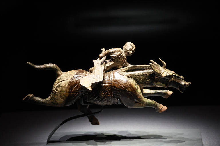 该文物为一件汉代绿釉陶俑,塑造了勇士骑马飞奔的生动形象。其造型极富动感,刻画传神:骏马呈三蹄腾空、作疾驰状;马背上的武士则挎弓持刀,神情冷峻,仿佛正在传递紧急情报。无论战时还是平时,马始终是古代交通运输和信息传递的重要力量,中国很早就建立起较为完备的驿传系统,“驿骑如星流”,成为国家高效治理的重要保障。