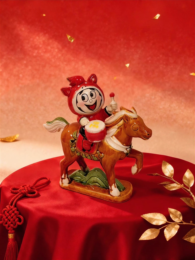 洛阳唐三彩多以黄、绿、白为主要釉色,且盛行于唐代,故名“唐三彩”。唐三彩烧制技艺现为国家级非遗代表性项目。唐三彩中,马的题材比较多,其塑造手法也十分出色,有的扬蹄飞奔,有的徘徊伫立,有的引颈嘶鸣,形态生动逼真。随着时代的发展,代表性传承人在继承传统的基础上,创新设计了一系列新的三彩马,如憨态可掬的墩墩马,已经成为洛阳旅游的主打伴手礼。今年春节,高家三彩、张家彩窑与国民消费品牌跨界联合推出的“马上雪王”与“马上旺”两大文创在网上走红。
