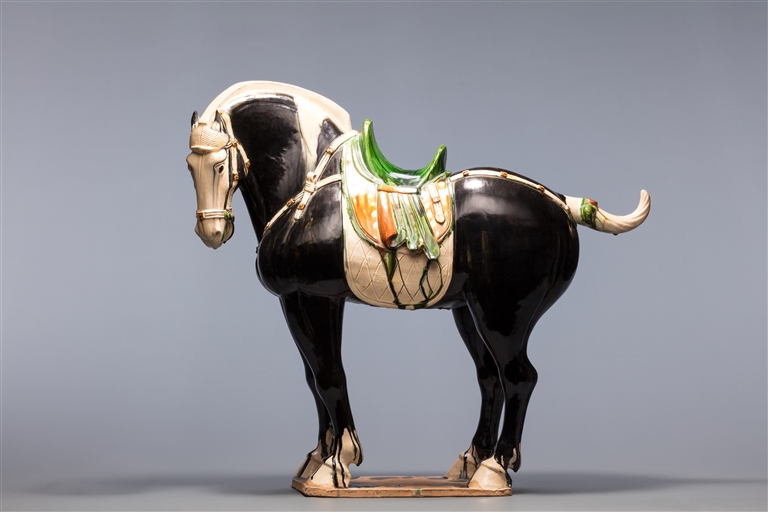 三彩黑釉陶马是中国国家博物馆的“明星文物”,1972年出土于河南洛阳,为国内仅有的两件唐代黑釉陶马之一。马俑除面、鬃、尾、蹄涂白釉外,全身披黑釉,有“四蹄踏雪”之美感。其造型呈现盛唐御马典型特征:颈长头小、膘肥臀圆、体魄健壮,四蹄呈行进姿态,马尾绾结上翘,参考了中亚地区的突厥马种。马鞍鞯饰以绿、黄、白三色釉,革带配有15枚浮雕纹饰圆形配件。这件陶马造型雄健,釉色调匀,姿态自然,是唐三彩马中不可多得的精品。