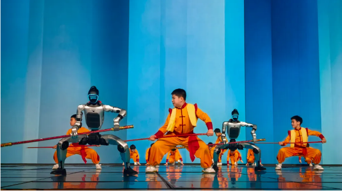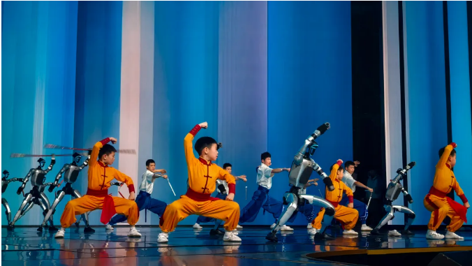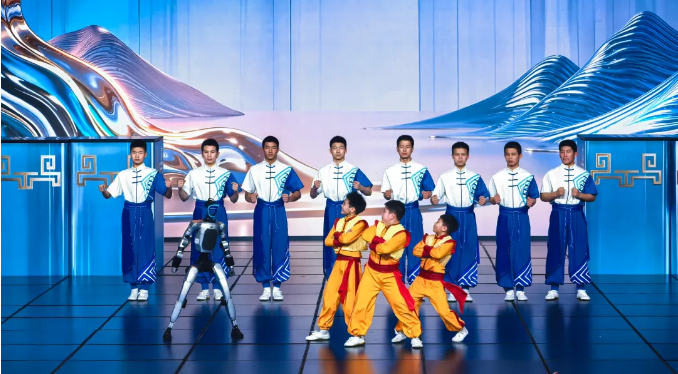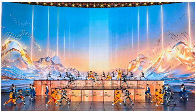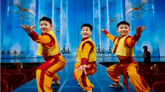 欢快的旋律中,3名功夫少年自观众席跃出,一招一式利落刚劲。大幕徐升,身披科技感的机器人整齐列阵,与少年们同步起势,人机合一的武术操练动作划一、气势如虹,瞬间点燃全场,尽显传统武魂与现代科技的初次碰撞。