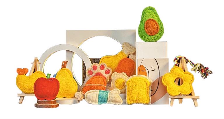 由丝瓜络制成的各式各样的宠物玩具。受访者供图