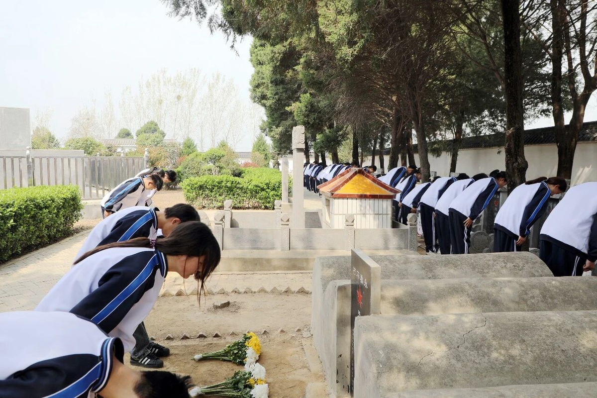 路远长天阔,志当万里行。在历经三小时、二十多公里的徒步远足后,师生们抵达本次研学活动目的地——被誉为“扶沟小延安”的柴岗乡塔湾村。早在1925年,这里就出现了扶沟县的第一名中共党员。从土地革命到抗日战争再到解放战争,该村先后有500多人参加革命。烈士陵园内安葬着18位该村革命烈士和6位牺牲在当地的山东籍无名烈士。