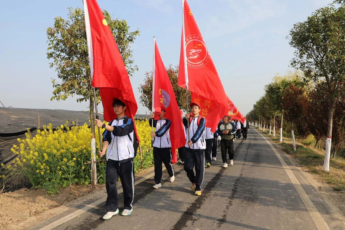 旌旗猎猎引征程,少年意气贯长虹。伴着激昂的鼓声与飘扬的旌旗,师生们分列两队,迈着自信的步伐穿行于幸福河畔,嘹亮歌声与春风和鸣,尽显高中学子的蓬勃朝气。
