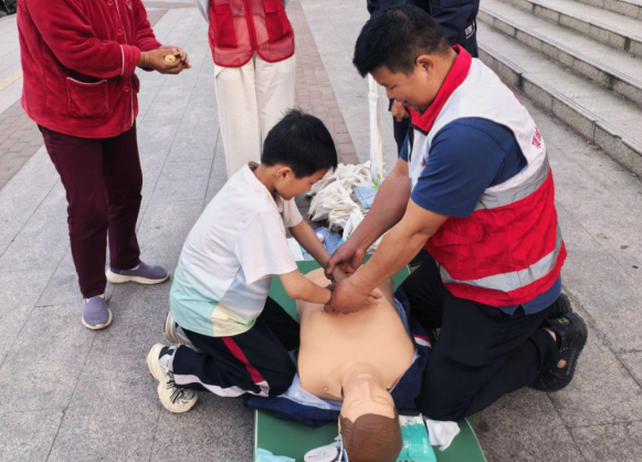 活动当天,当地曙光应急救援队出动3车5人,全程投入3小时服务,与项城市红十字会工作人员密切配合,搭建起简易实用的“急救地摊”。不同于传统培训模式,此次地摊式培训聚焦实用性和通俗性,工作人员通过现场演示、模拟操作、互动答疑等方式,向过往群众普及心肺复苏、止血包扎、气道异物梗阻处理等常用应急救护知识,手把手指导群众掌握急救核心动作,打破群众对急救技能的陌生感和畏难情绪。