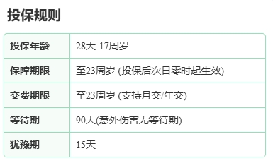 投保年龄:出生满28天-17周岁,覆盖从新生儿到青少年的全阶段;