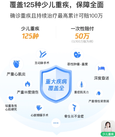 125种重大疾病:确诊即一次性给付100%基本保额(最高100万),覆盖严重心肌炎、白血病、深度昏迷等少儿高发重疾;