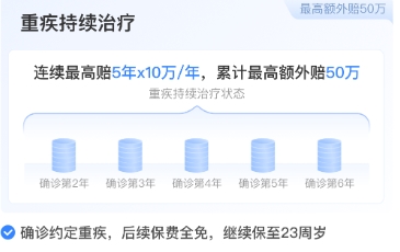 重疾持续治疗保障:确诊重疾后,连续5年每年给付20%基本保额(以100万保额为例,每年20万,累计最高50万),针对重疾长期治疗的费用缺口;