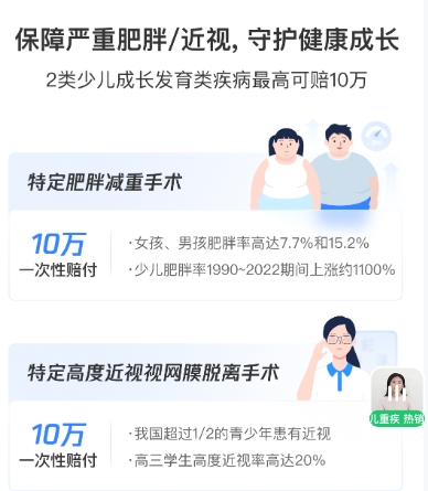 2种少儿成长发育疾病(0-6岁可选):针对严重肥胖减重手术、高度近视视网膜脱离手术,一次性给付20%基本保额(最高10万),贴合少儿成长健康风险。