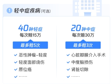 40种轻症+20种中症(可选):轻症每次赔付3万,最多赔5次;中症每次赔付6万,最多赔3次,覆盖疾病早期风险;