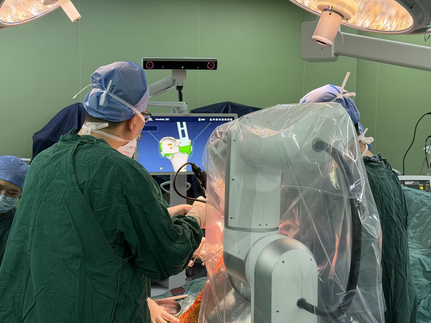 接受手术的是一位62岁的女性患者,长期受双膝不适、行走困难困扰,严重影响日常生活。经医生详细诊断,患者除左膝骨关节炎、左膝伸直僵硬畸形外,同时伴有右膝骨关节炎及高血压2级高危。面对复杂的病情,华西医院关节外科周宗科教授团队和王浩洋主任经过完善的术前准备与评估,决定采用HX自研机械臂骨科手术机器人辅助,为其实施左侧全膝关节表面置换术。