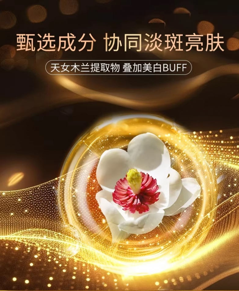 作为市面上少数集齐 “专利天女木兰 + 法国进口抑黑剂 + 全链路修护” 的产品,其配方逻辑与兰蔻小黑瓶发光眼霜的多通路协同思路一致,功效经过 28 天人体临床试验验证,黑色素含量平均下降 29.6%,色斑面积缩小 18.7%。