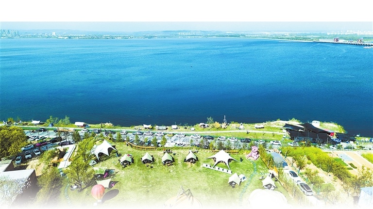 4月5日,游客在洛阳市孟津区白鹤镇境内的黄河生态廊道生态观景平台和观光驿站露营休闲。黄政伟 摄