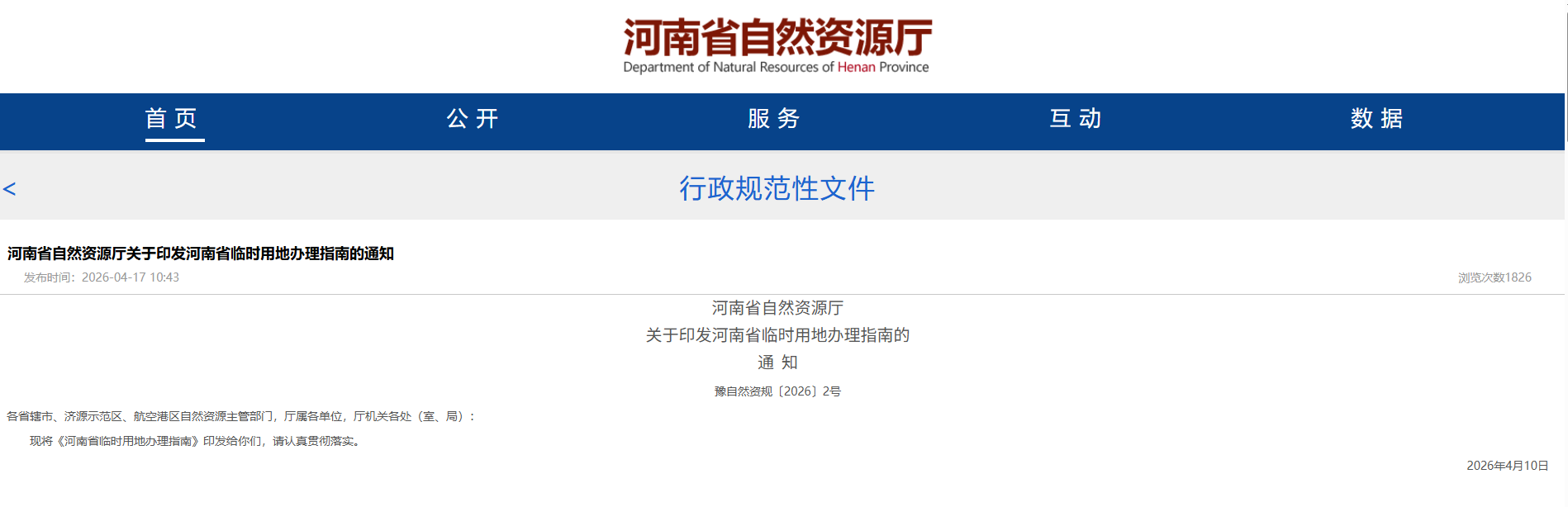 大河网讯 为规范临时用地管理,日前,河南省自然资源厅印发《河南省临时用地办理指南》(以下简称《指南》),进一步明确临时用地使用范围,优化办理流程,在严守耕地保护和生态安全红线的同时持续优化用地审批服务,提高土地资源利用效率。