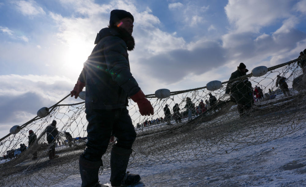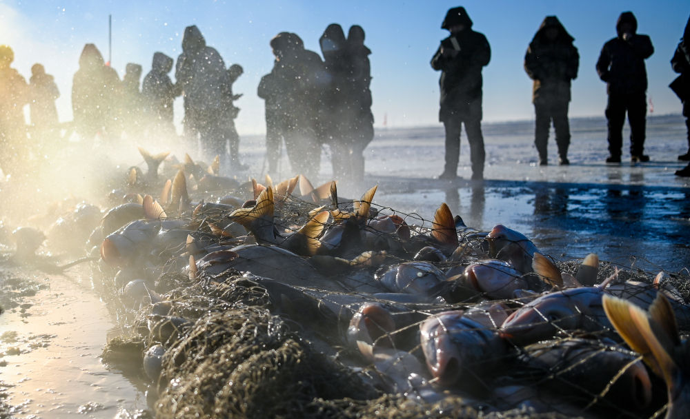 2026年1月7日,渔民们将渔网拖出查干湖冰面。
