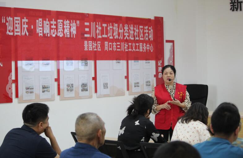 本台讯 为进一步弘扬志愿者精神,提高居民垃圾分类意识,9月26日上午,周口市三川社工义工服务中心组织部分社工志愿者走进城乡一体化示范区文昌办事处景园社区,开展“迎国庆 唱响志愿精神”垃圾分类进社区活动。