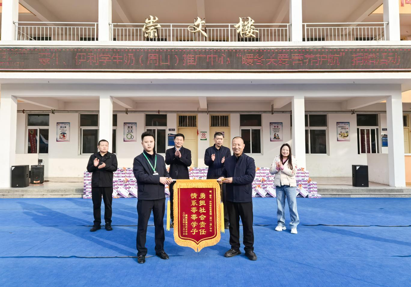 最后,包勇平代表爱心企业向豫东武术学校校长朱明峰授捐赠牌,豫东武术学校向爱心企业回赠锦旗,并邀请参会领导及师生代表共同合影留念。