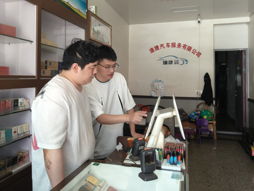 图为客户经理指导零售户使用双屏机开展店铺管理。林凯摄