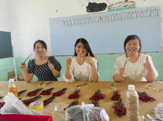 “你看看我这个对不对?”“应该这样,你注意看我的手法,不用一个一个串,量好一块儿放进去就能直接绕线了。”几张桌子拼在一起铺上绿色的桌布凑成了一张手工台,前来领取木簪制作材料的“巧手媳妇”们三五成群聚在一起边做手工边交流。陈金环是“巧手媳妇”里的“佼佼者”,一根木棍、两截丝线、几粒小珠、三五朵花,在她的手中两分钟内就能组成一只精美的古风木簪。“俺家做粮食收购的,俺这收麦忙一个月,收玉米两个月,一年到头就忙三个月,平时还要照顾老人、小孩儿做家务,这听说管做手工编织,不会第一书记还亲自教,还给我们提供材料,真的挺好的。我觉得上不了班的、在家带孩子的都可以做,我又带了5个人,俺们6个互相学习天天一起有事做。”陈金环说。