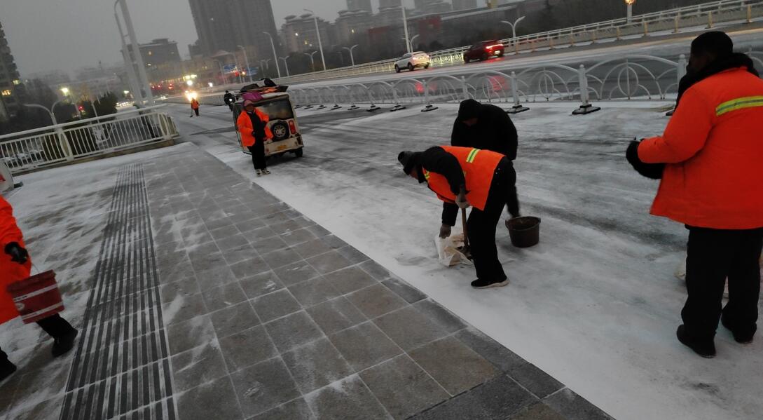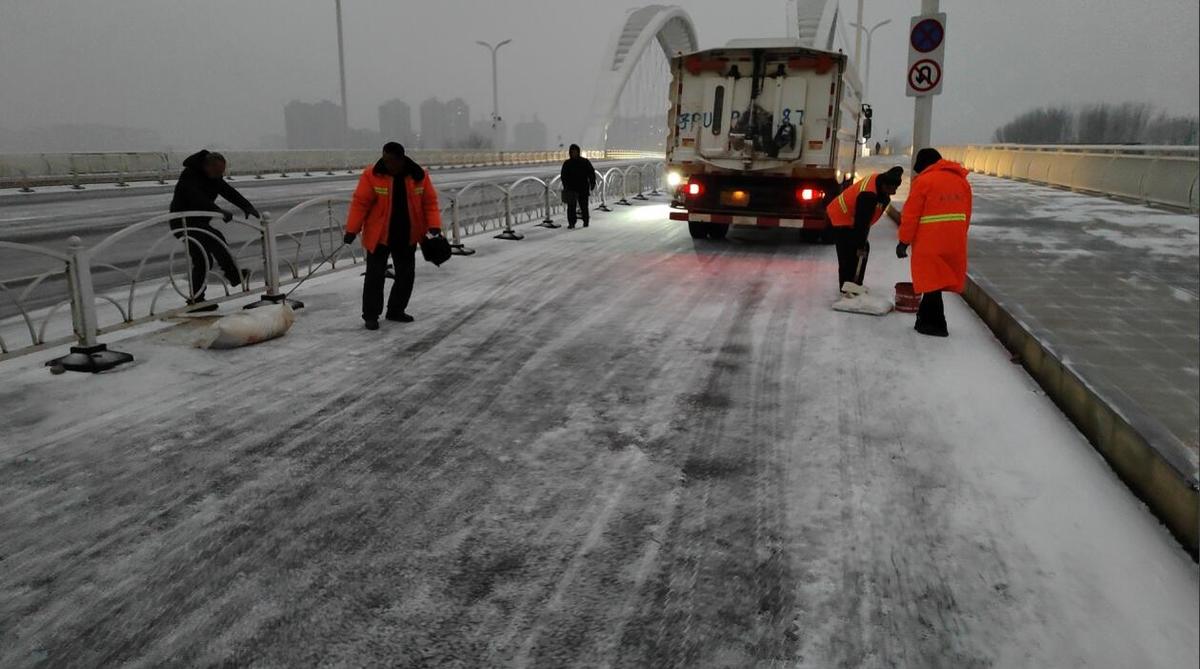 据悉,为应对此次雨雪寒潮,市中心城区城管系统提前谋划、科学应对,按照先桥梁、涵洞、十字路口、主干道,再次干道的顺序进行 “全方位、全覆盖”清雪除冰作业,合理撒施除雪剂,做到“随降随清、雪停路通”。截至目前,共出动融雪剂撒布机、除雪车等150多台次,对主要干道桥梁、涵洞抛撒融雪剂180余吨,共出动除冰人员4000人次。