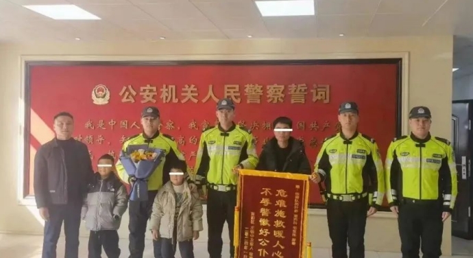 原来是1月29日下午15时,周口交警铁骑队员正在辖区巡逻时,接到周口市公安局110指挥中心指令,称有一辆车在华耀城附近,车上载着一名脑出血儿童急需前往周口市中心医院救治,需要紧急护航送医。正值年关期间,城区道路车流量较大,情况十分紧急,铁骑大队教导员焦良接到指令后,立即安排巡逻车组叶豪、潘克科迅速前往并沿途寻找求助车辆,同时安排另一车组毛亚伟、孙豪到周口中心医院附近疏通一条生命道路,经过多方努力,仅用5分钟就将求助车辆安全送达至周口中心医院,给孩子争取了宝贵的救治时间。铁骑队员将孩子送到急救室后,就悄然离去。如今孩子已经痊愈,王先生一家为表示对铁骑队员的感谢,特意寻找打听当初护送车辆的四名队员,并带锦旗前往单位进行当面感谢。
