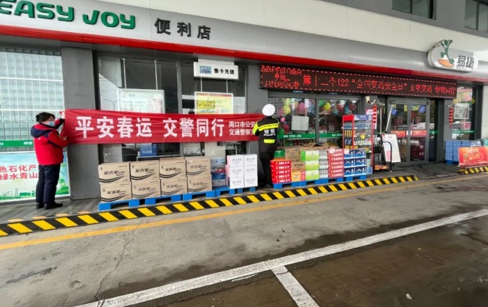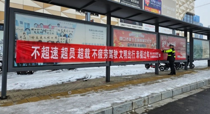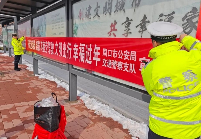 活动中,周口公安各大队宣传民辅警深入辖区客货运场站、高铁站、汽车站、加油站、小区等场所,通过张贴海报、悬挂条幅,向群众宣传春节期间超速超员超载疲劳驾驶的危害,自觉做到开车不喝酒,喝酒不开车,安全文明出行,平安幸福过节。