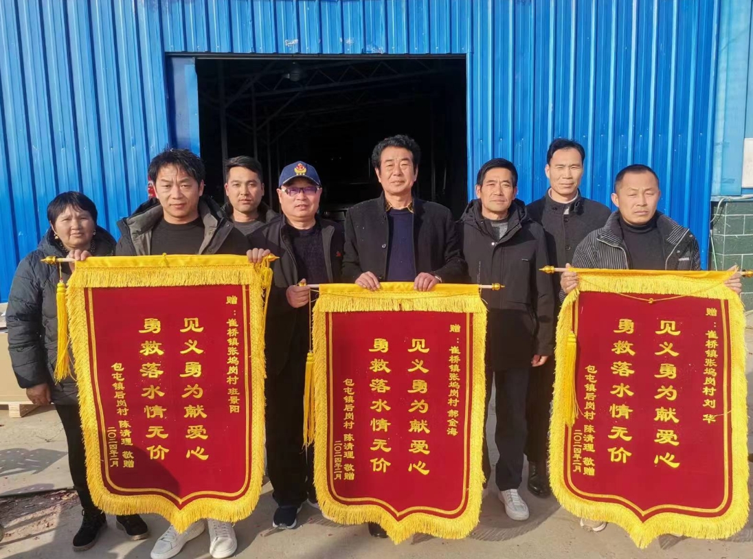 本台讯 2月15日,扶沟县崔桥镇张坞岗村内鞭炮齐鸣,来自包屯镇后岗村的陈清礼一家特意向张坞岗村村民班景阳、郝金海、刘华三人送上了三面写有“见义勇为献爱心 勇救落水情无价”字样的红色锦旗,以表达感激之情。