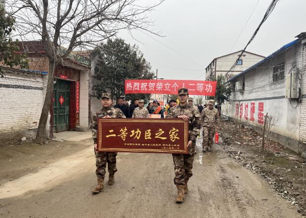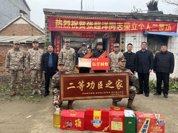 本台讯 军营建功勋,家乡扬美名。3月1日,西华县人武部、县退役军人事务局一行到红花集镇宁庄行政村现役军人张超洋家中,为其家属送去了二等功喜报、奖匾和慰问金,让军人家属共享这份荣耀和喜悦。