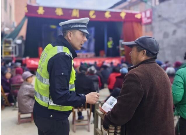 宣传民警利用演出间隙走上戏台,结合农村道路实际情况和农村群众出行特点,向村民宣讲交通安全常识,提醒大家拒绝乘坐农用车、三轮车等违法车辆上路,不超员超载、酒后驾驶,驾乘汽车全程全员系好安全带,骑乘电动车、摩托车要佩戴安全头盔,遵守交通安全法律法规。同时,民警向村民发放交通安全宣传资料,呼吁广大村民自觉抵制交通陋习,“文明交通,你我同行”,共同营造良好的道路交通环境。