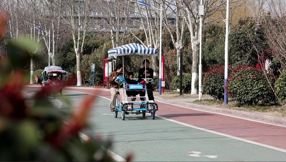 记者在郸城县人民公园里看到,柳枝在春风的吹拂下发出新绿,嫩绿的细芽与波光粼粼的湖面相互映衬,宛如一幅生动的水墨画,彰显出春天的勃勃生机。前来游玩的市民三三两两,或漫步其中,或跑步运动,或骑行游玩,一路上都是踏青赏景的人群,他们时而驻足赞美,时而拿出手机定格眼前美景。