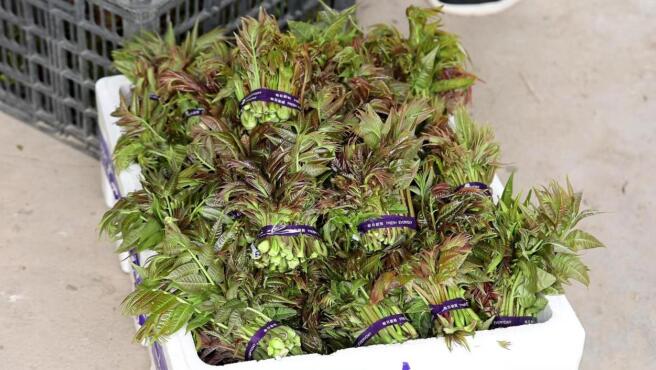 香椿种植基地负责人王梅说:“差不多一天能出产400至500斤,单价大概是15至18块钱一斤。”