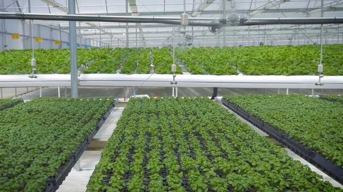 走进海容模块温室,上万株菜苗长势正旺,一排排智能化分式喷淋系统正在工作。目前,园区内已建成玻璃联动温室6座、联动薄膜温室4座、海容模块温室43座,装有卷帘设备,可内部控温、排湿,并装有水肥一体化灌溉设备36台,温室育苗能力可达3000万株。