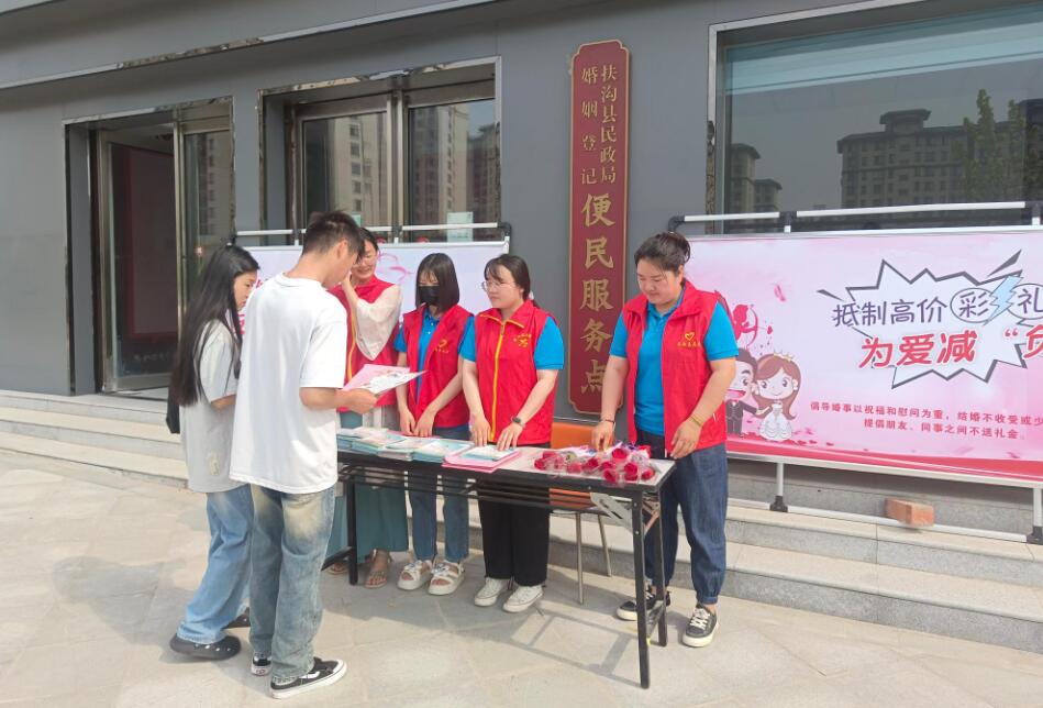本台讯 为大力弘扬中华民族传统美德,培育文明婚嫁新风尚,营造简朴文明的婚嫁氛围,5月20日,扶沟县在当地政务大厅婚姻登记窗口和民政部门各便民服务点组织开展“抵制高价彩礼、深化移风易俗”主题宣传活动。