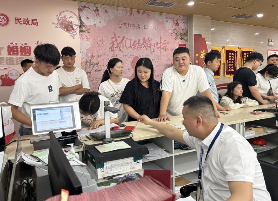 今年的“520”恰逢小满,迎来了一大批新人办理结婚证的高峰期,活动现场,工作人员向新人们介绍了婚俗改革具体内容,加强他们对婚俗陋习、文明婚俗新风的了解,帮助婚姻登记当事人树立科学对待婚俗新风的意识。
