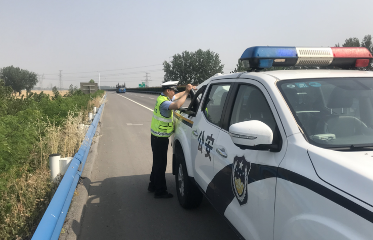民警看到这种情况,立即停车打开警灯警笛做好警示,并在来车方向摆放好反光锥筒,做好安全防护措施。当民警上前准备检查询问时,男子没等民警开口便立即说道:“车辆高温走不了了,所以才停车的。”