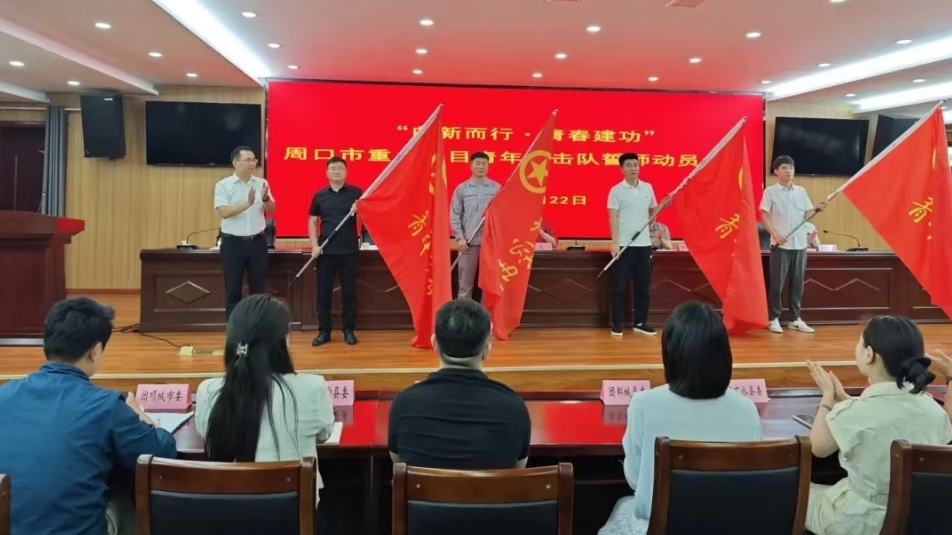 本台讯 为全面加强新时代周口青年突击队建设,激励动员广大团员青年勇挑重担、冲锋在前、在中国式现代化建设周口实践中发挥生力军和突击队作用,5月22日,“向新而行·青春建功”周口市重点项目青年突击队誓师动员大会举行。
