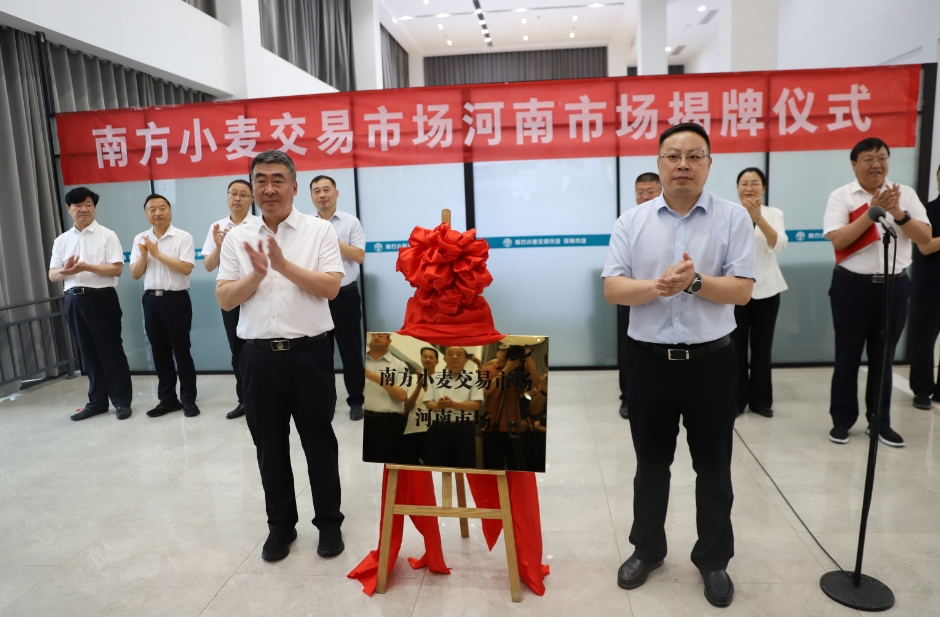 周口临港开发区党工委书记孙鹏与南方小麦交易市场有限公司母公司、江苏华穗粮食(集团)有限公司党总支副书记王俊共同为南方小麦交易市场河南市场揭牌。