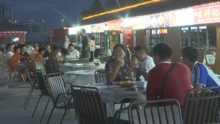 在“三川十馆·夏集”小吃街,这里小吃种类丰富,海鲜、烧烤、冷饮等美食应有尽有,更是推出了啤酒全场免费畅饮活动,吸引不少市民前来感受浓浓烟火气。