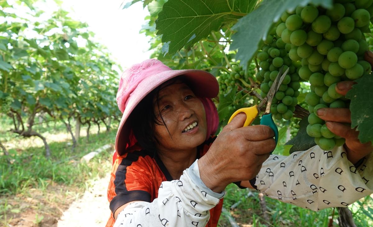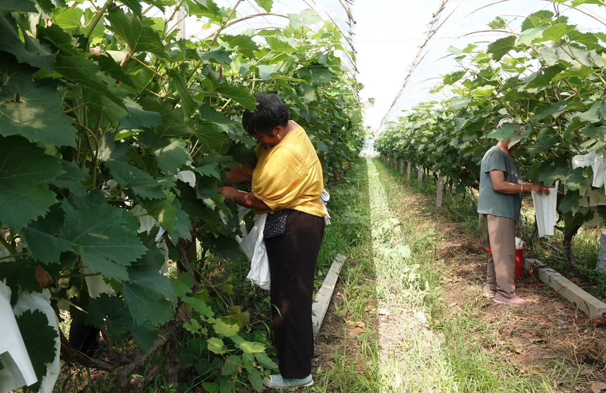 “俺在这里干农事钟点工,每天有60到70元的收入,离家近,既能照顾家庭又能挣零花钱,很方便。”正在为葡萄“穿衣”套袋的村民李桂兰说。