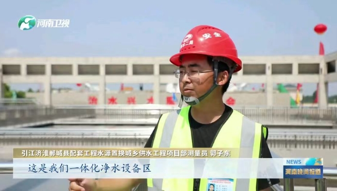 引江济淮郸城县配套工程水源置换城乡供水工程项目部测量员郭子东说:“这是我们一体化净水设备区,经过三大安全程序可以达到安全饮用标准,满足全县人民用水需求。”