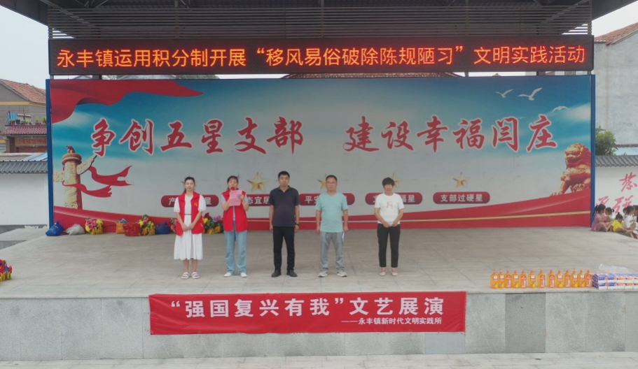 本台讯 近日,一场运用积分制开展“移风易俗破除陈规陋习”的文明实践活动在项城市永丰镇闫庄行政村的文化广场举行。活动不仅为闫庄行政村的村民们带来了文艺表演,更为村民们兑现了一年来积攒的文明积分。随着村民们逐一上台领取礼品,大家“赚积分”的热情也随之高涨。