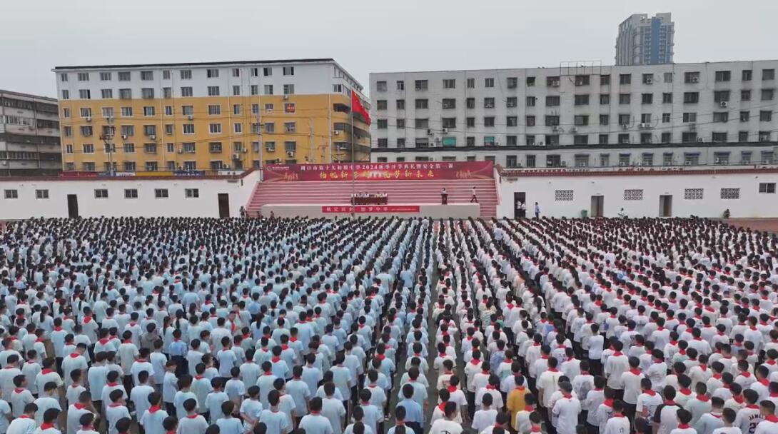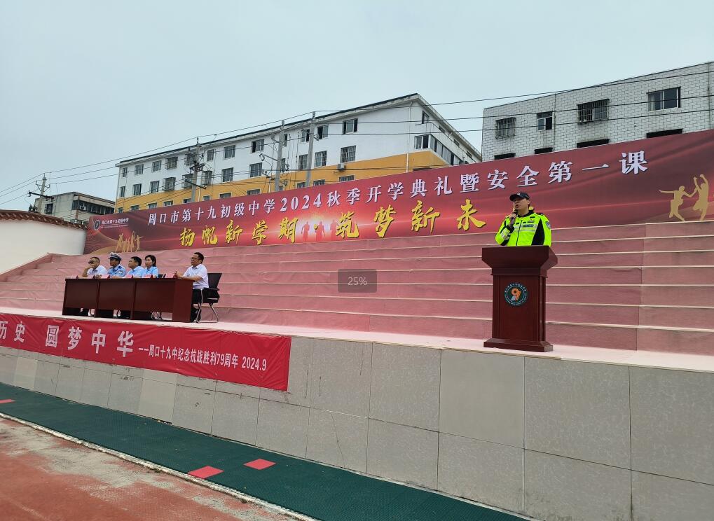 记者在周口市第十九初级中学看到,全体师生齐聚操场举行隆重的升旗仪式。特邀交警部门同志为全校师生上了一堂别开生面的“开学第一课”——交通安全宣传教育活动,在生动普及相关知识的同时,进一步增强了同学们道路交通安全意识。