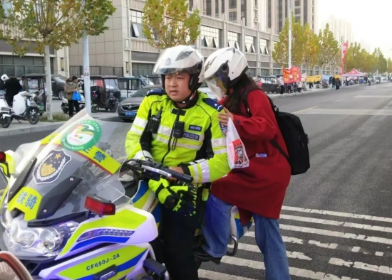 12月1日上午7时45分许,在川汇区梧桐路小学考点,一考生到考点大门口后发现自己身份证丢失,着急地向门口执勤的周口交警求助。周口交警铁骑队员一边安慰考生不要着急,一边联系附近派出所做好补办临时身份证明的准备,并由交警负责驾驶摩托护送考生赶往七一路派出所补办证件。在周口交警和七一路派出所民警的共同帮助下,该考生顺利补办出证件,安全顺利返回考点参加考试。周口交警爱心护考尽显责任担当,用实际行动为广大考生安心考试筑起一道安全屏障。