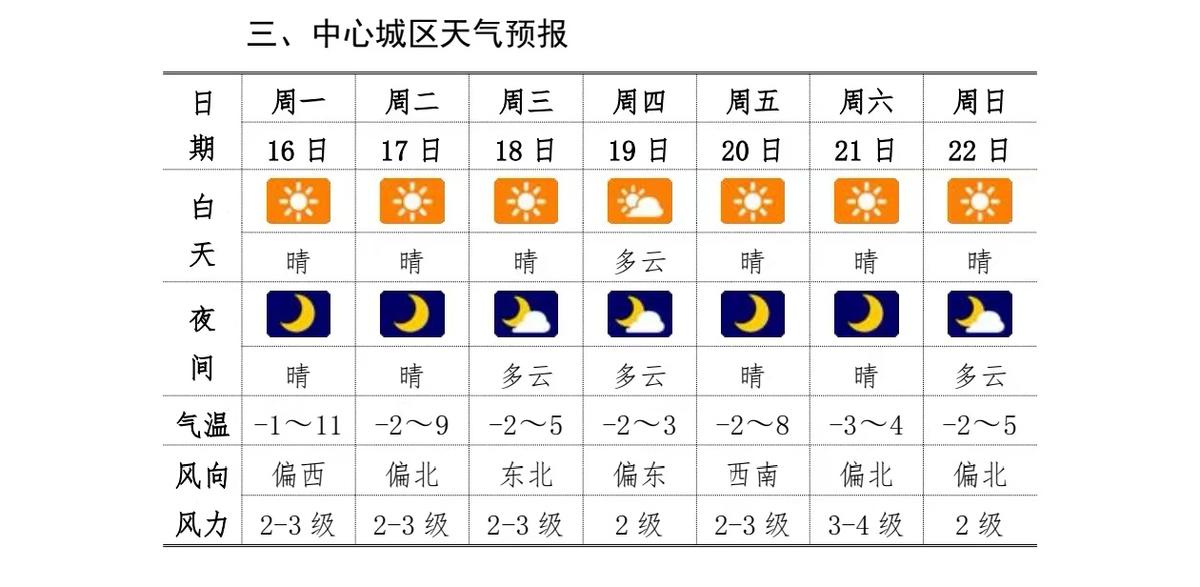 16日(周一),晴天间多云,偏西风2到3级,气温-3℃~11℃;