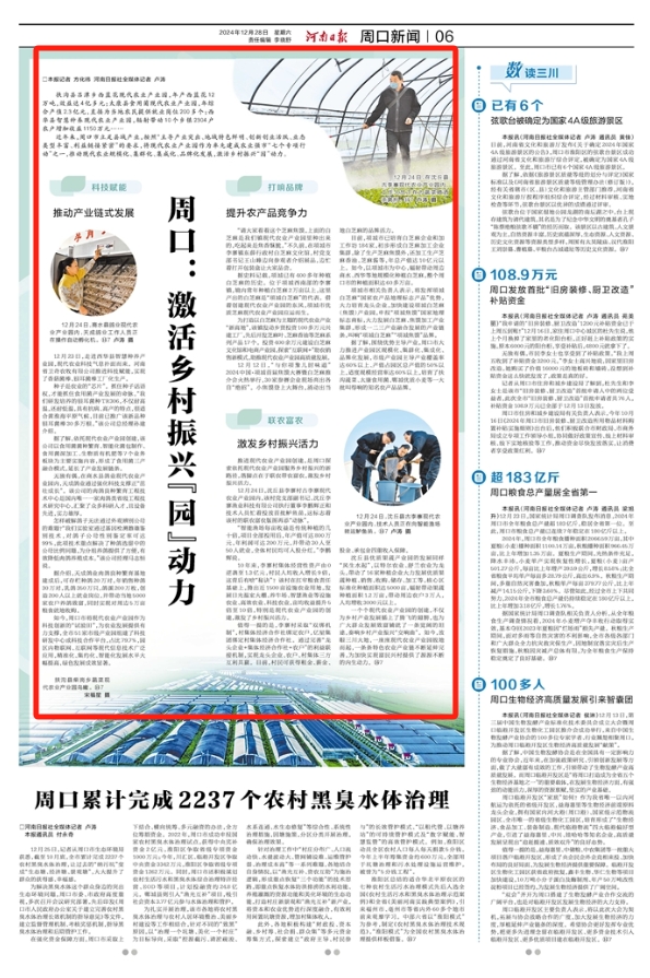 本台讯 2024年12月28日,《河南日报》以《周口:激活乡村振兴“园”动力》为题,报道了近年来周口市立足县域产业,按照“主导产业突出、地域特色鲜明、创新创业活跃、业态类型丰富、利益链接紧密”的要求,将现代农业产业园作为率先建成农业强市“七个专项行动”之一,推动现代农业规模化、集群化、集成化、品牌化发展,激活乡村振兴“园”动力的相关情况。具体内容如下: