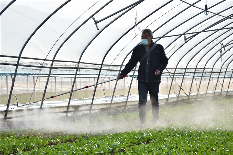 12月24日,在沈丘县古李寨现代农业产业园内,工作人员正在为蔬菜喷洒杀菌剂。卢涛 摄