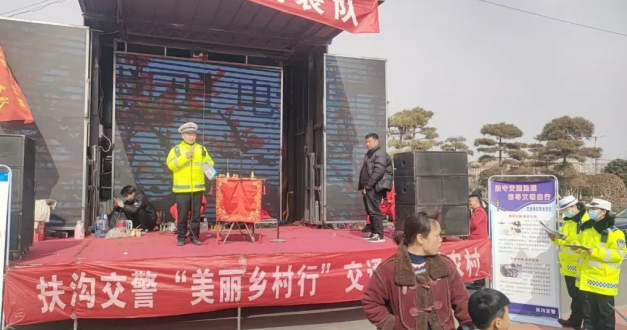 元宵佳节期间,扶沟县公安局交警大队组织宣传小分队深入辖区城郊乡庞庄行政村,巧借附近举办唢呐、舞龙、舞狮等文艺活动的有利时机,开展“美丽乡村行”交通安全巡回宣讲活动。