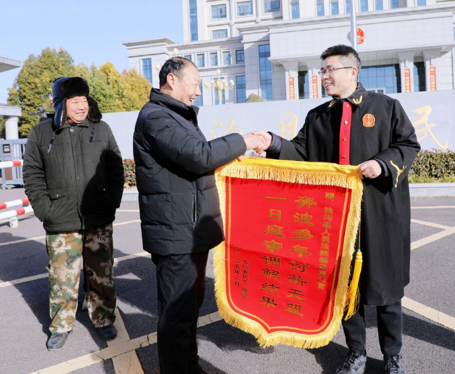 法官一方面向工地负责人详细讲解相关法律法规,明确其支付工资的义务和拒不支付的法律后果;另一方面从情理出发,引导其理解农民工的艰辛与不易。经过数小时的耐心调解,双方最终达成还款协议。七位农民工激动不已,将新年的第一面锦旗送到杨思勇法官手中,表达他们的感激之情。