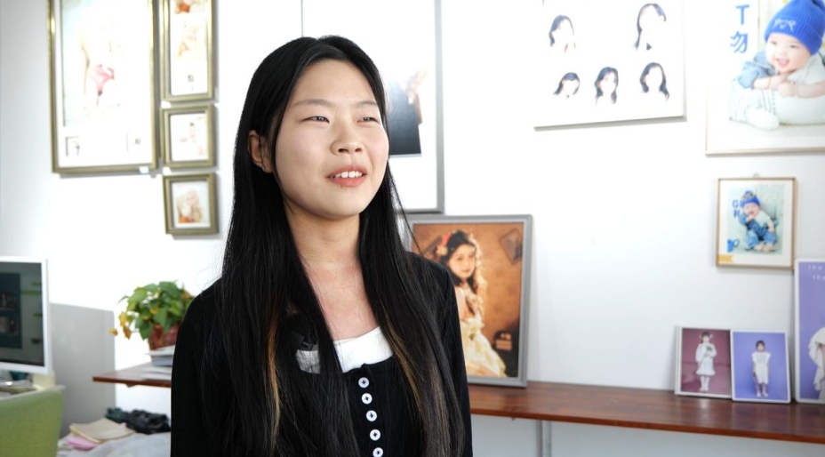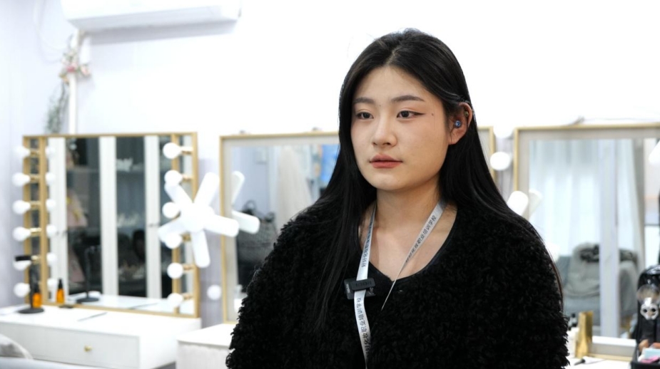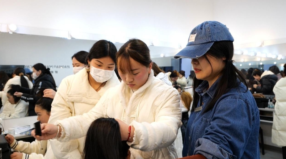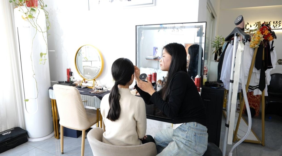 市民张焕焕在完成六个月的婚礼跟妆课程后,成功入职知名造型工作室,如今已成为团队核心成员。工作室内,她正为即将拍摄的新娘设计妆容,手法娴熟利落。