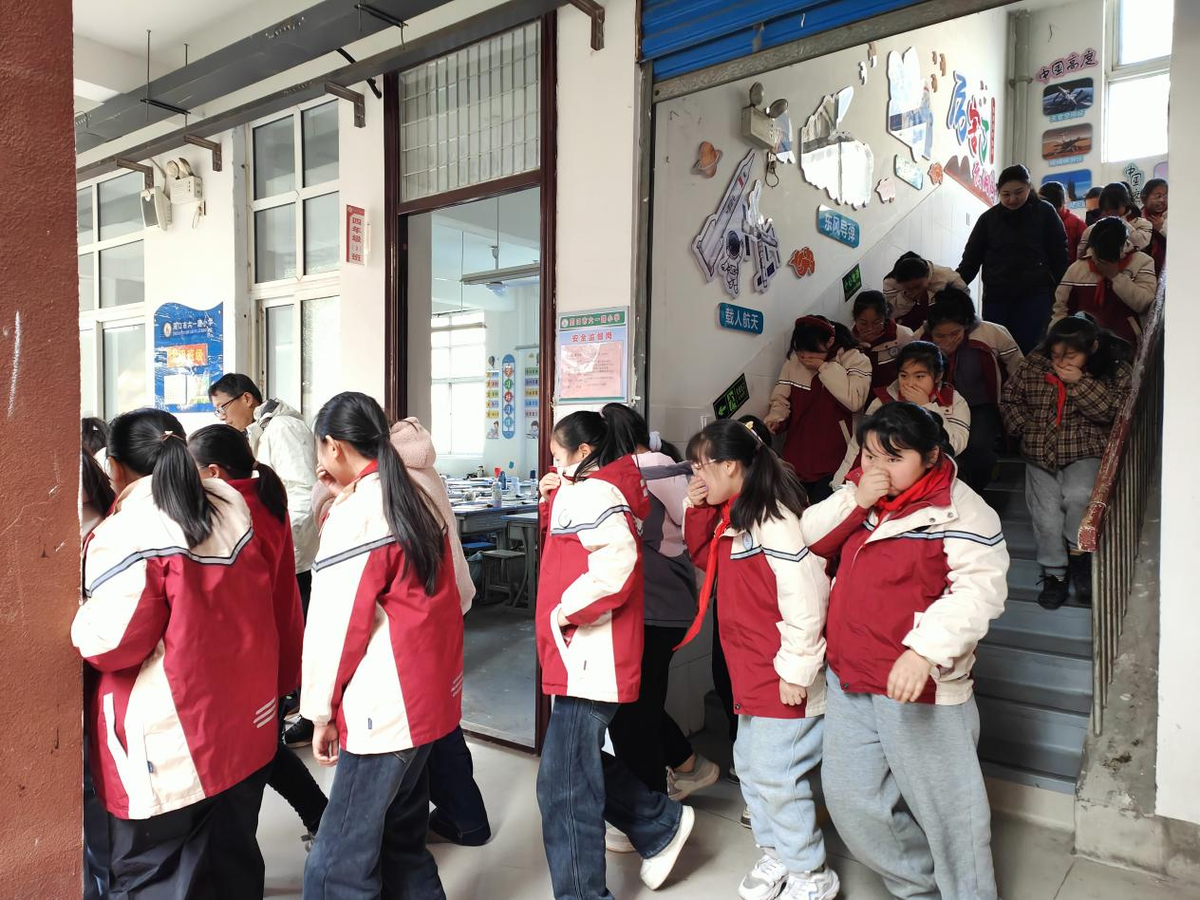 随着警报声响起,各班班主任迅速组织学生按照预定路线有序疏散。同学们在老师的带领下,用湿毛巾捂住口鼻,弯腰低姿,快速撤离到操场集合地点。整个疏散过程紧张有序,用时不到两分钟,达到了预期效果。