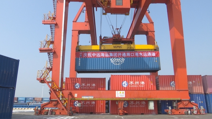 本台讯 2月27日,周口港至南通港集装箱航线在周口港范营作业区开航,该航线由国内航运“龙头”企业中国远洋海运集团有限公司运营。中远海运的入驻将对周口港拓展物流新通道,提升货物吞吐力和辐射力起到重要作用。
